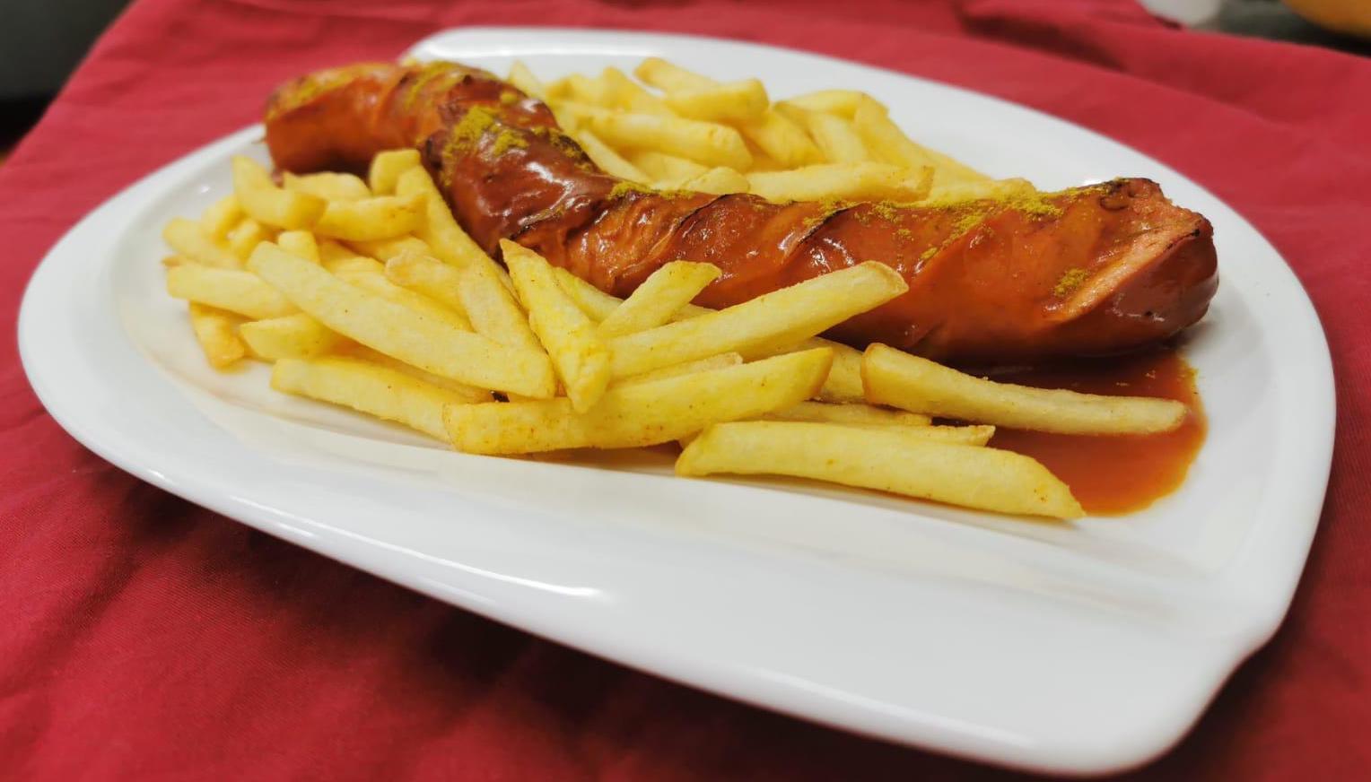 Schweinestreifen mit Pommes, Gurken und scharfer Soße (Scharf)